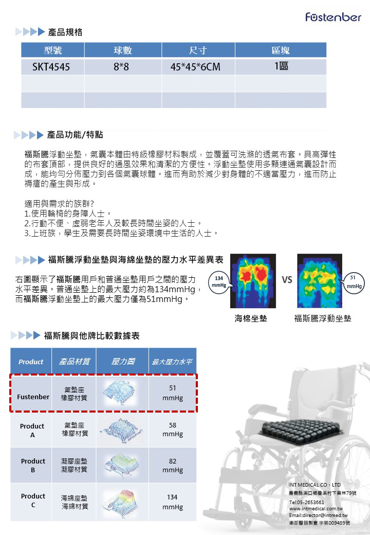 SKT福斯騰浮動坐墊使用多顆連通氣囊設計而成,能均勻分佈壓力到各個氣囊球體。有助於減少對身體的不適當壓力,進而防止褥瘡的產生與形成。